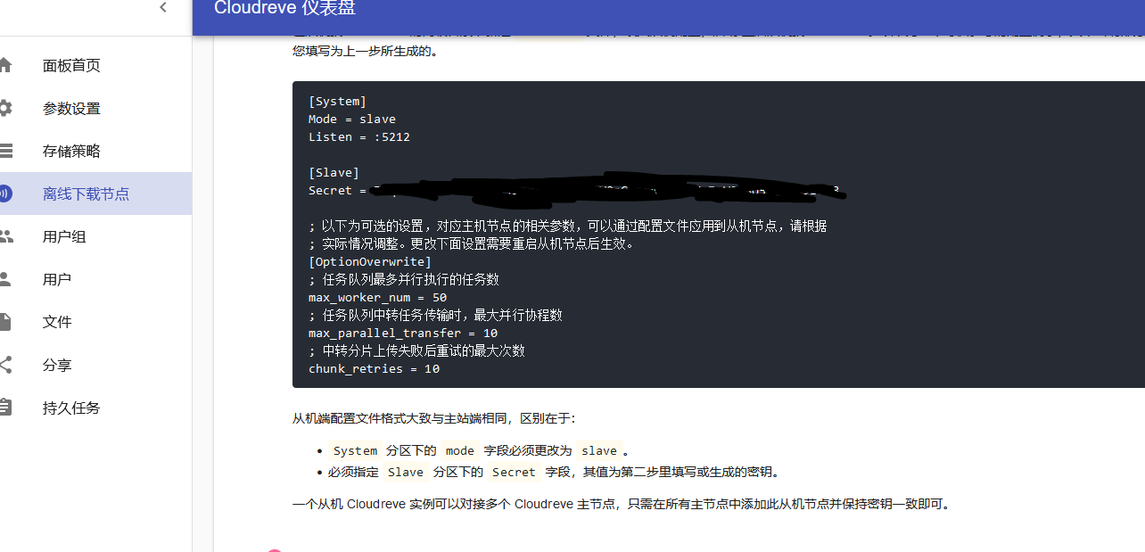 先不要启动,在主机的cloureve控制面板中点击储存策略,点击添加储存策略,在弹出的窗口中选择从机储存,把下面的复制一下,在从机端 Cloudreve 的同级目录下新建 conf.ini 文件,填入从机配置,再启动从机端 Cloudreve。