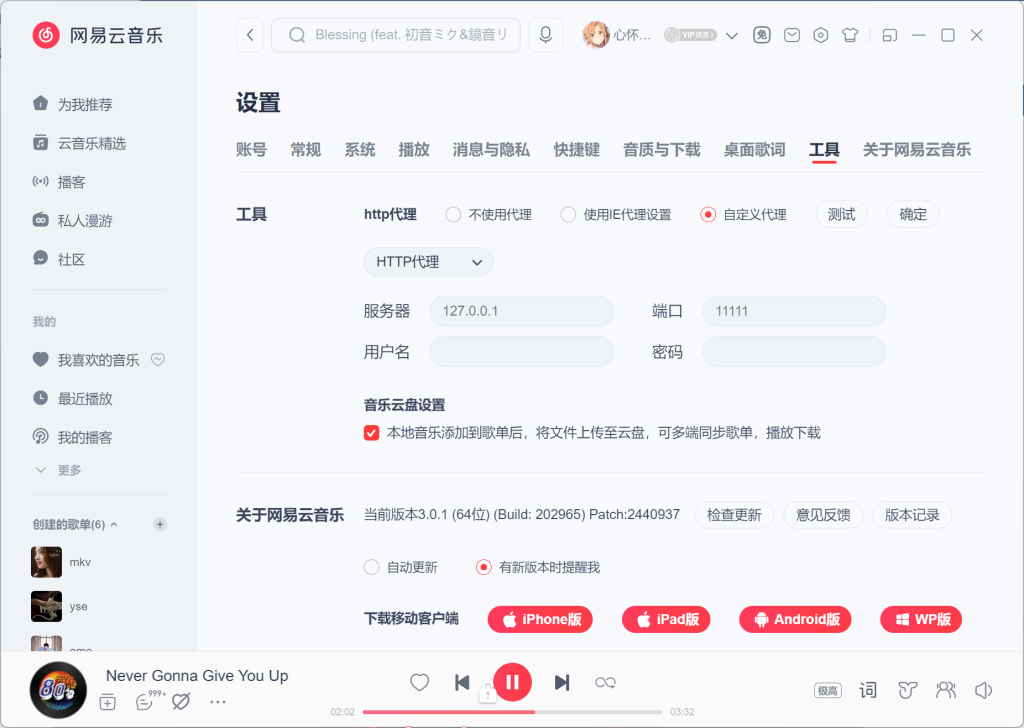 在网易云设置中把http代理设置为如下(注:地址和端口也可以按照你喜欢的来设置,对应即可)