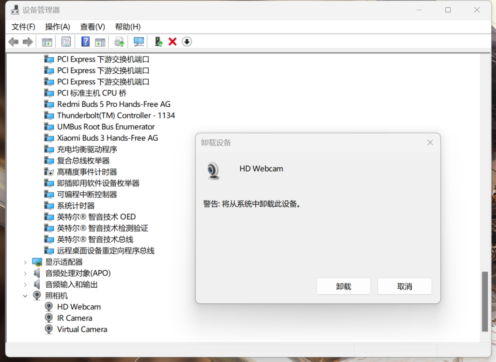 右键点击 HD Webcam 和 IR Camera ,选择卸载设备