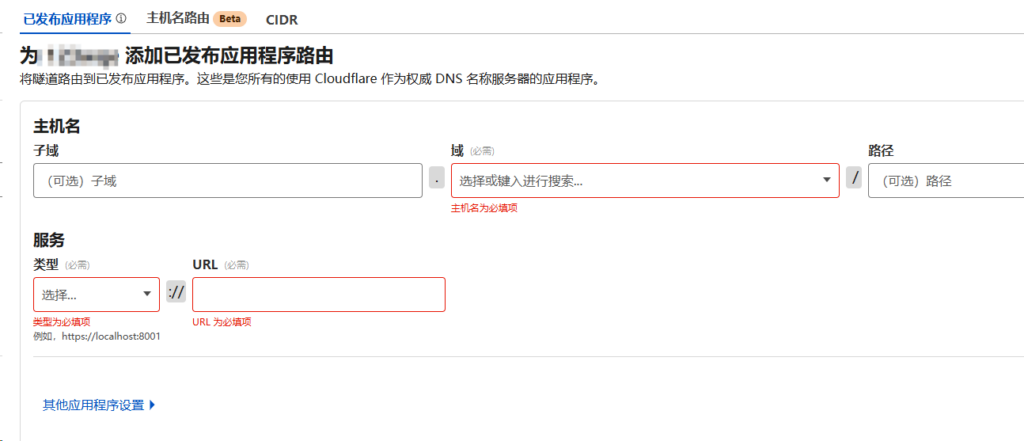 在创建并安装完成隧道后我们就可以绑定域名了,在此界面下填写你想要访问的域名以及内网的服务域名