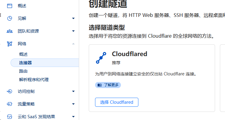 首先登录到Cloudflare One的控制台 ,点击网络-连接器进入,创建一个隧道,选择Cloudflared,同时为你的隧道命名。